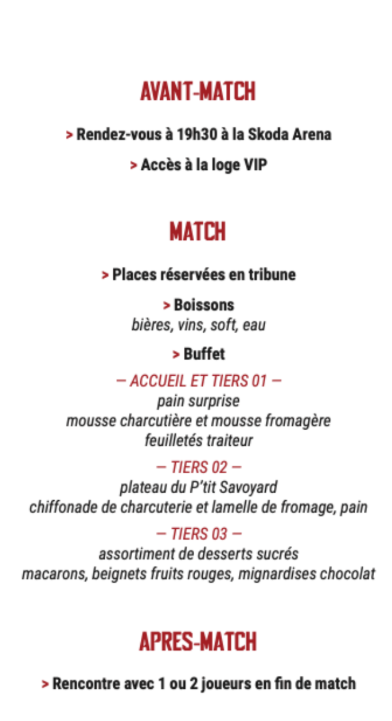 Les conditions d'accueil seront exceptionnelles. Le prix est de 60 euros TTC par personne tout compris (accès à la loge VIP, réservation places en tribune, restauration, boissons).